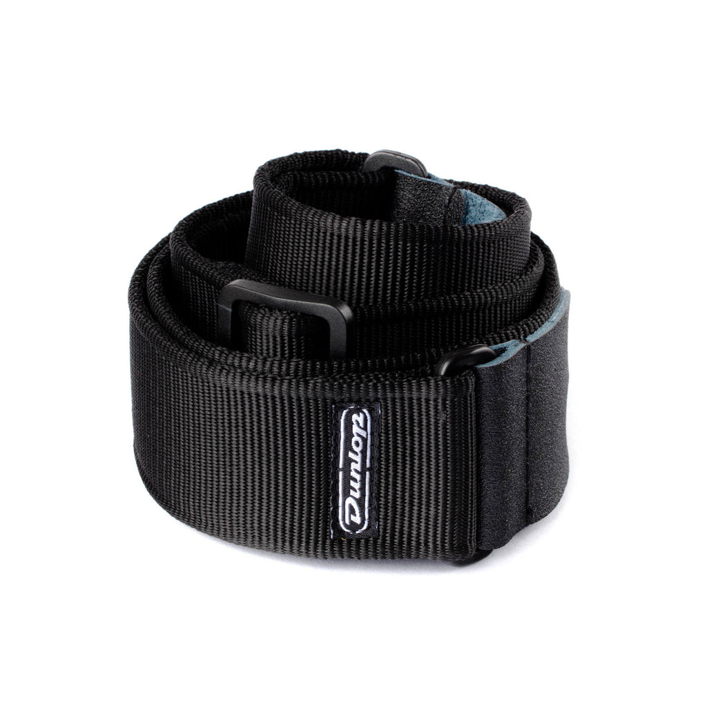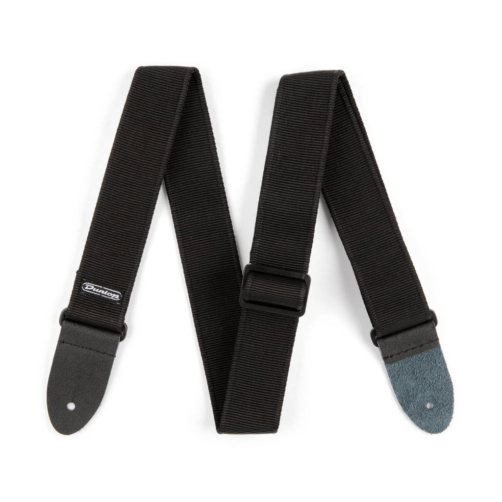Una correa negra clásica para guitarra y bajo, cómoda, resistente y ajustable; ideal para sesiones largas y uso habitual.