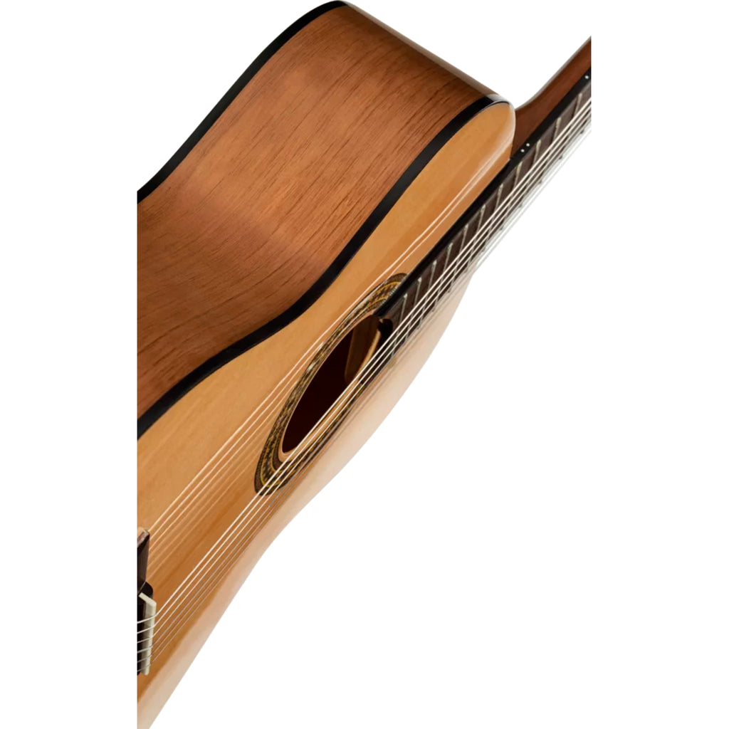 Excelente relación calidad-precio: materiales confiables (tapa de pícea, cuerpo de catalpa, mástil de caoba, diapasón de nogal) para un sonido cálido y balanceado, con acabado brillante.
