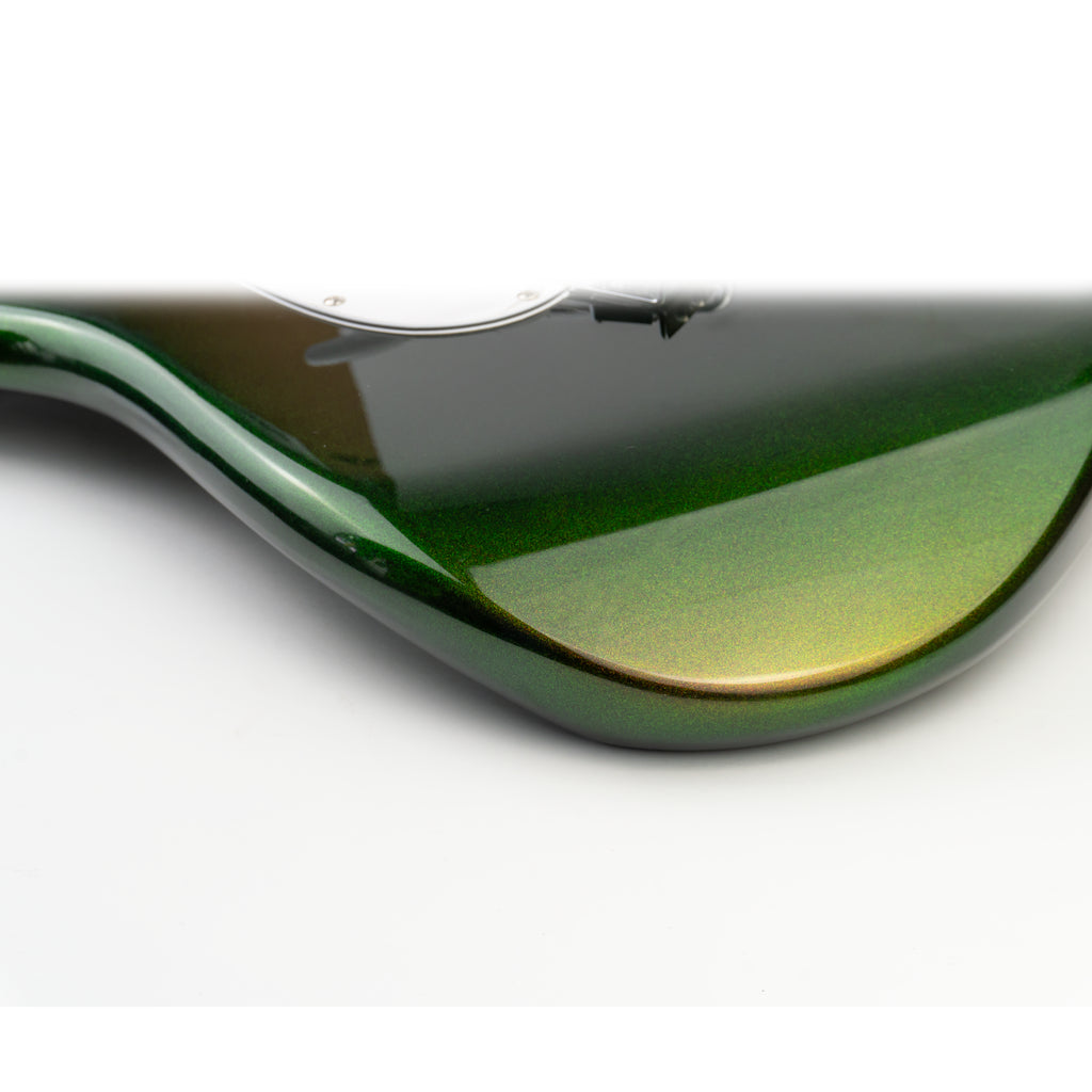 Cuerpo de linden (tilo), ligero y resonante; acabado brillo alto que cambia de verde a dorado dependiendo del ángulo