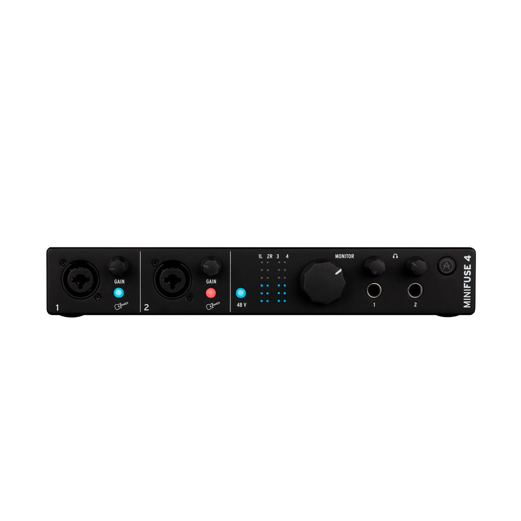 La Arturia MiniFuse 4 es una interfaz de audio y MIDI de escritorio potente y versátil, ideal para estudios caseros, bandas, productores y creadores de contenido. Ofrece 4 entradas y 4 salidas analógicas, doble salida de auriculares y conectividad MIDI de 5 pines, junto con un hub USB integrado para conectar controladores u otros dispositivos. Su chasis de aluminio es robusto y portátil, y su diseño incluye medidores VU en color, controles de ganancia retroiluminados y alimentación phantom de 48 V para micrófonos de condensador. Además, incluye un conjunto de software profesional (“Analog Lab Intro”, “Ableton Live Lite”, efectos de Arturia, etc.) para producir desde el primer momento.