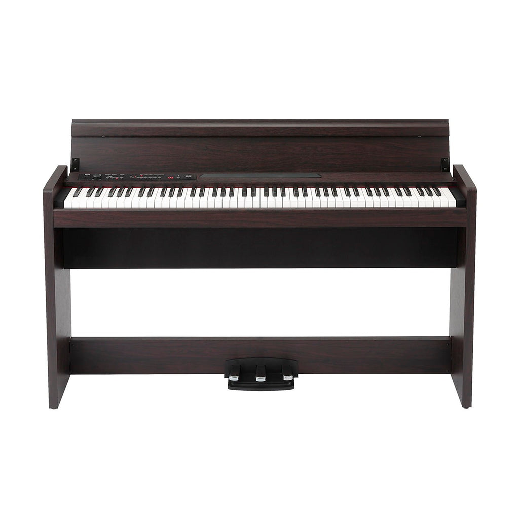 El Korg LP-380-RW es un piano digital de 88 teclas con un diseño estilizado y elegante gracias a su acabado en palo rosa veteado, que le da una presencia cálida y sofisticada. Incorpora el teclado de acción de martillo real RH3, ofreciendo una experiencia de interpretación muy cercana a la de un piano acústico. A pesar de su forma compacta, cuenta con tres pedales (damper, sostenuto y soft), amplificación potente, 30 sonidos diferentes y conectividad USB/MIDI, lo que lo convierte en una opción ideal tanto para el hogar como para estudios y escenarios pequeños.
